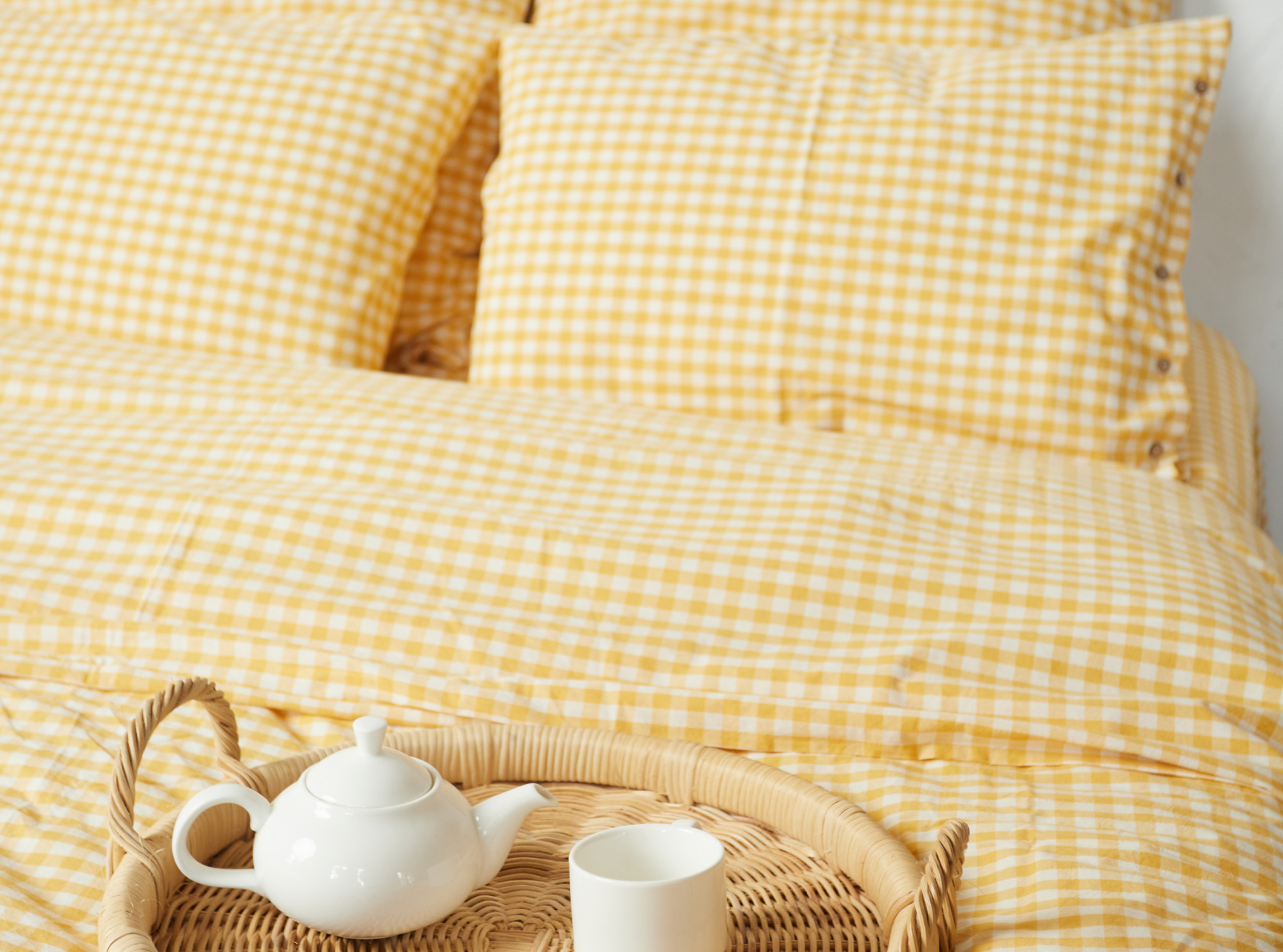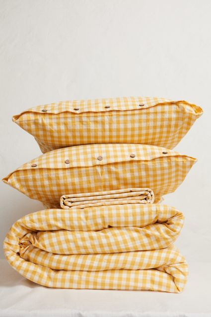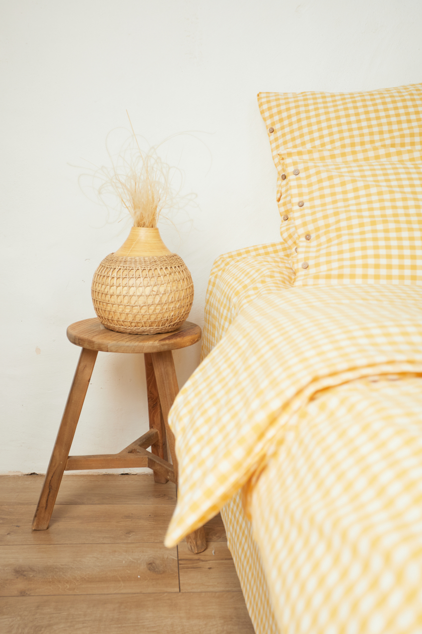 Комплект постільної білизни двоспальний варена бавовна жовтий в клітинку з 4 подушками простирадло на резинці
